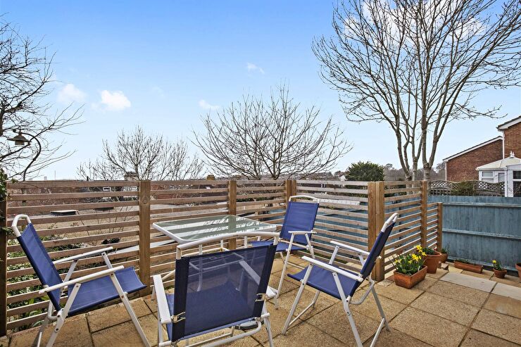 Raised patio are with distant sea views and steps leading to 2nd patio area. Lawn area with rear gate leading to: