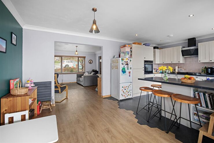 Open plan fitted kitchen with matching wall and base units incorporating the integral oven, hob and extractor hood. Space/plumbing for washing machine. Space for fridge/freezer. Integral dishwasher. Sink with drainer and mixer tap. Breakfast bar area. Archway through to: