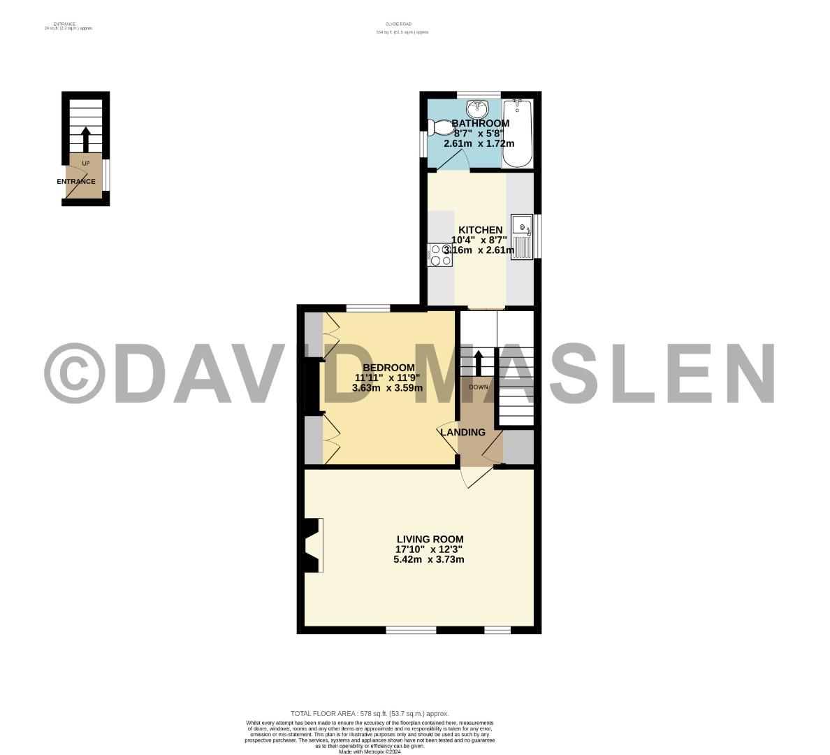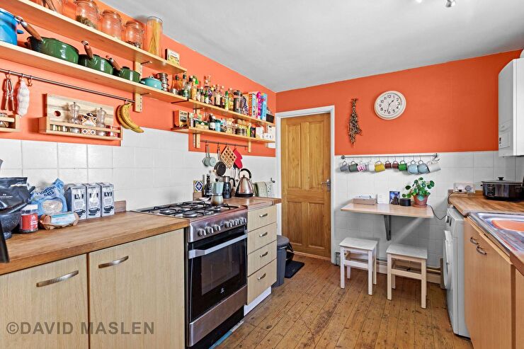 Matching wall and base units incorporating the electric cooker with the four ring gas hob. Space/plumbing for the washing machine. Space for fridge and freezer. Wooden flooring. Double glazed side aspect window. Wall mounted gas central heating boiler. Door leading to: