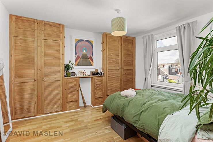 Two double glazed front aspect windows with distant views. Radiator. Wall mounted electric fire. Wooden flooring.