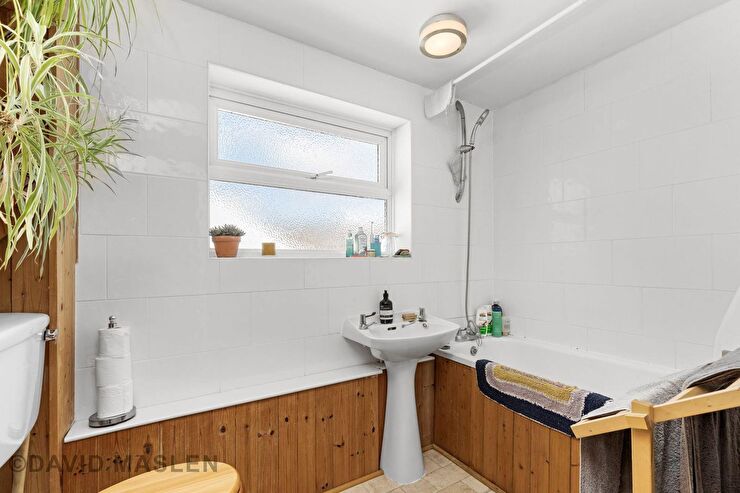 Double glazed rear aspect window. Panelled bath with shower attachment above. Pedestal wash hand basin. Low level WC. Radiator.