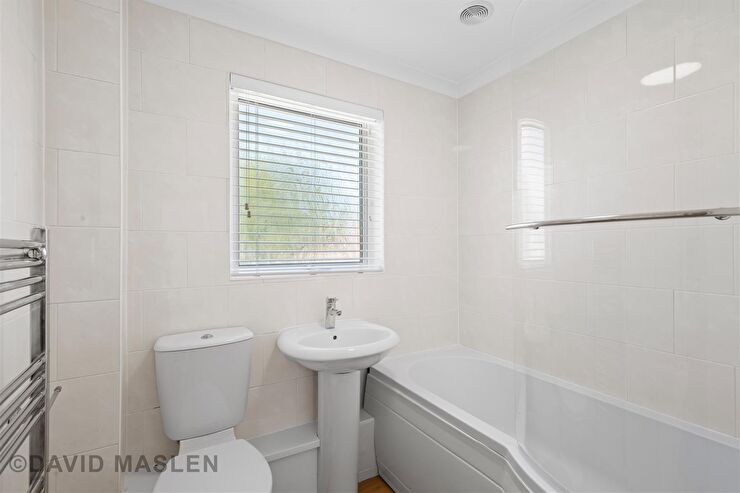 Double glazed front aspect window. Panelled bath with shower over. Pedestal wash hand basin. Low level WC.