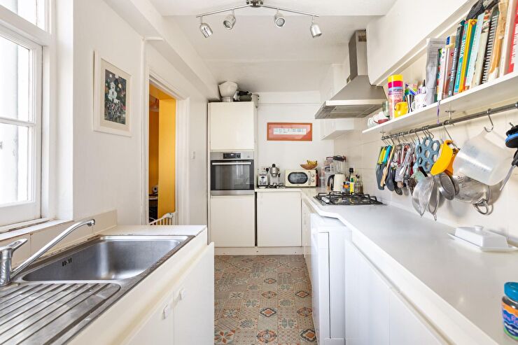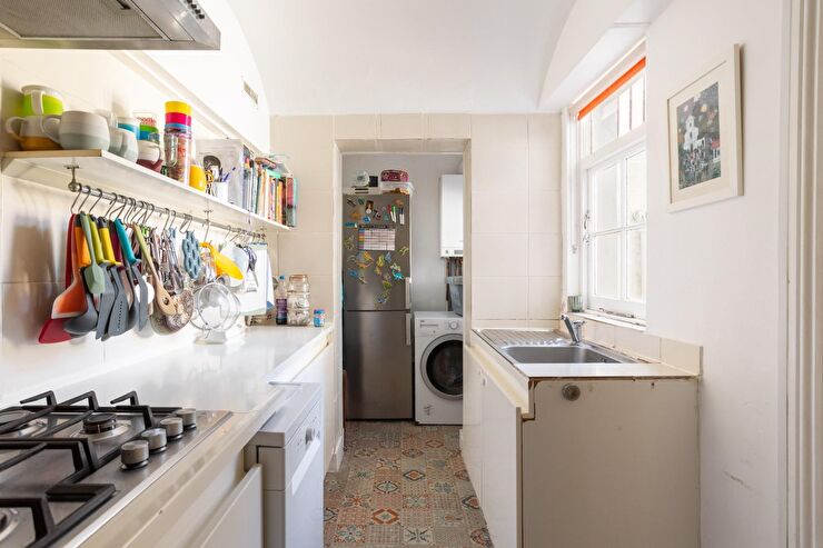 Space for fridge/freezer, space & plumbing for washing machine, wall mounted 'Viessmann' boiler, laminate flooring, window to side.