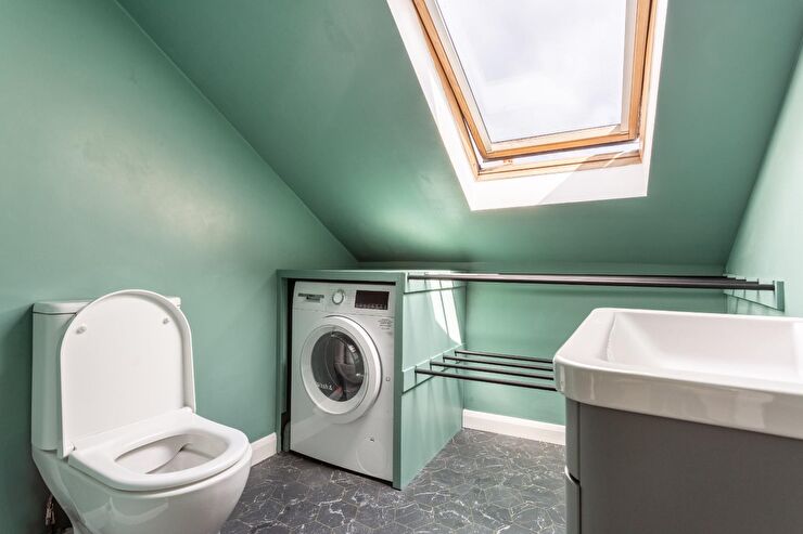 Low level close coupled WC with push button flush, wash hand basin with mixer tap & vanity storage below, shower cubicle with rainfall style shower head above, space & plumbing for washing machine with built in hanging space, heated towel rail, part tiled walls, laminate flooring, Velux window.