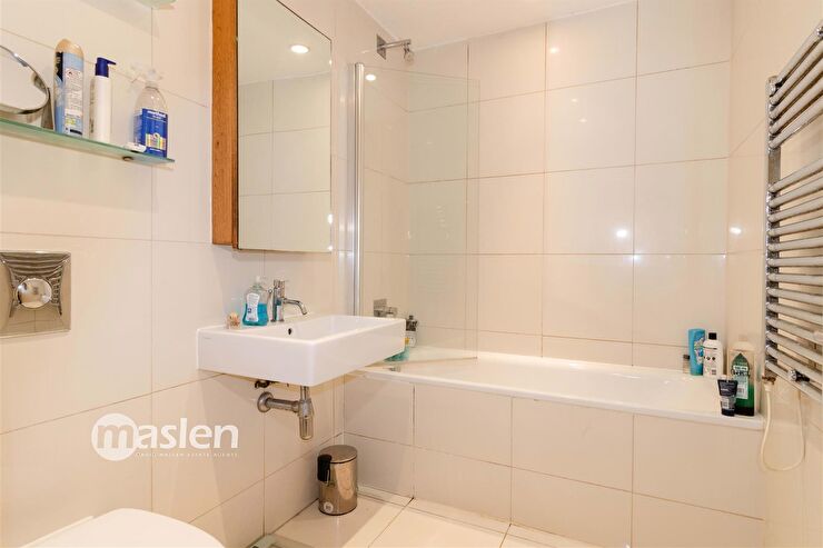 Comprising tile panelled bath with mixer tap & thermostatically controlled shower unit over, wall mounted wash hand basin with mixer tap, low level push button WC with concealed cistern, fully tiled walls & floor, heated towel rail.