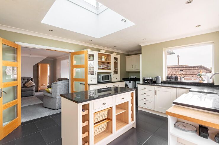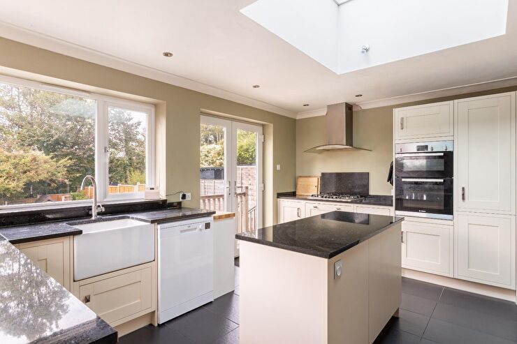 Range of wall, vase & drawer units with square edged work surfaces over, butler style sink with mixer tap, inset 5 ring gas hob with extractor over, integrated eye level 'BOSCH' oven, space for fridge/freezer, space for tumble dryer, space & plumbing for washing machine, space for dishwasher, upright radiator, recessed spotlights, tiled floor, window to side, window to rear, French doors to rear garden, skylight.