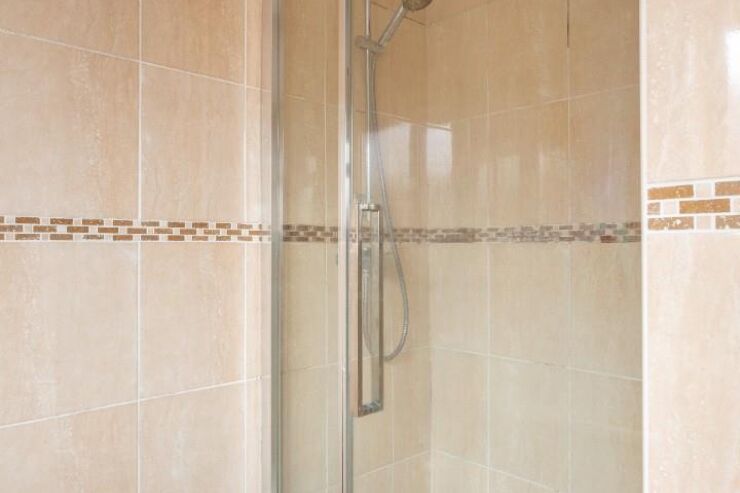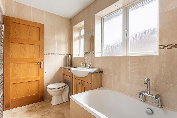 WC with concealed cistern & push button flush, wash hand basin with mixer tap & vanity storage below, panelled bath with mixer tap, large shower cubicle with mains fed shower unit over, ladder style heated towel rail, recessed spotlights, fully tiled walls, tiled floor, 2 x window to side with frosted glass.