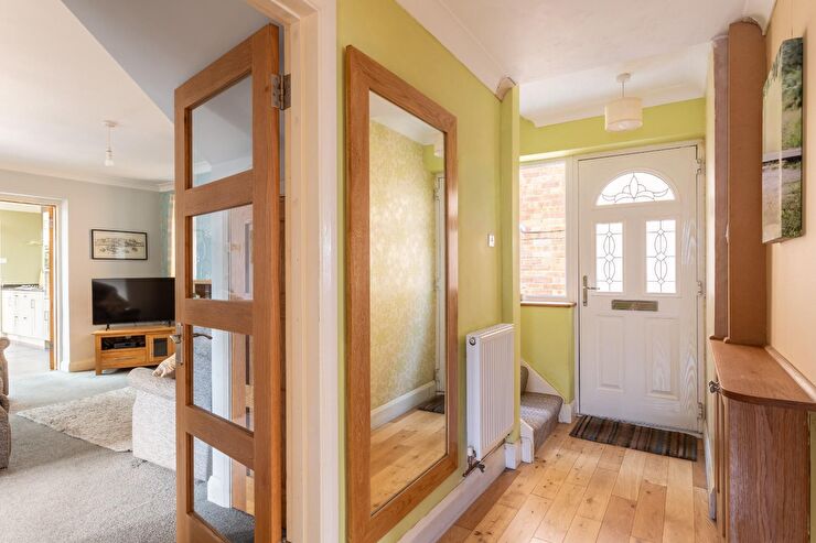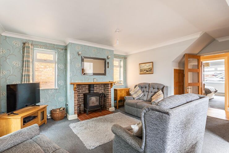Feature wood burner, 3 x windows to side, understairs storage cupboard, radiator, double doors to Kitchen.
