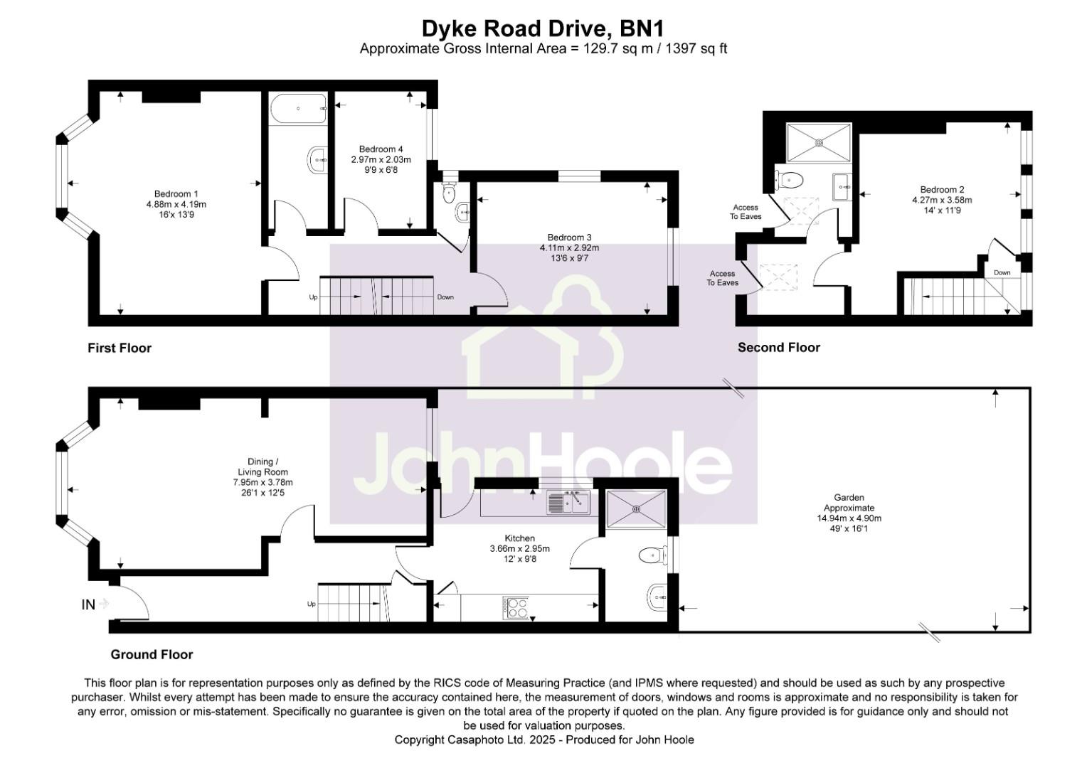 On the ground floor, the living room flows seamlessly into the dining room, enhanced by dual-aspect windows that allow sunlight to fill the space throughout the day. Original floorboards and a traditional fireplace add a cozy touch. A few steps lead down to a contemporary kitchen, fitted with sleek cabinetry and ample room for appliances. Upstairs, the two rear-facing bedrooms overlook the garden and can comfortably accommodate double beds, while the spacious front bedroom spans the width of the house, featuring a bay window that mirrors the one below. A wonderful master bedroom has also been created in the loft, complete with en suite, to provide spacious and luxurious accommodation. The rear garden is a peaceful retreat, with plenty of space to relax and entertain with friends and family.