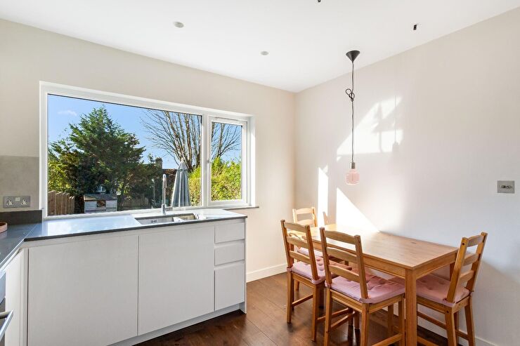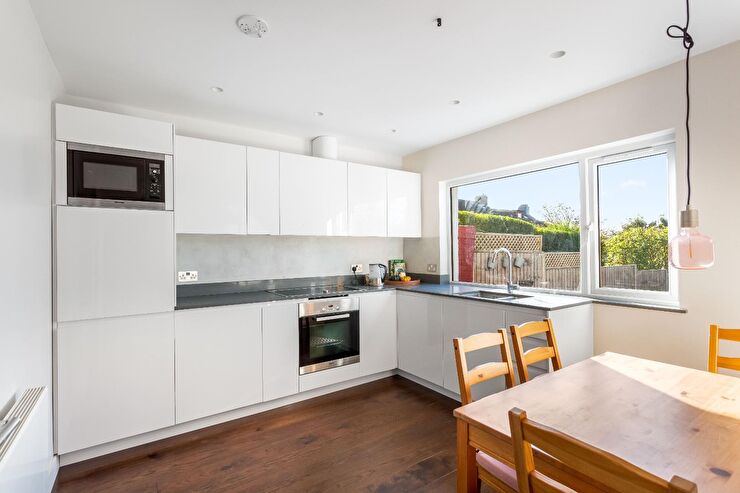 Range of wall, base & drawer units with square edged work surfaces over, inset 1.5 bowl sink unit with mixer tap, inset hob with extractor over, integrated oven below, integrated dishwasher, integrated fridge, integrated freezer, integrated microwave, space for table & chairs, radiator, recessed spotlights, thermally treated solid oak flooring, window to rear overlooking garden.