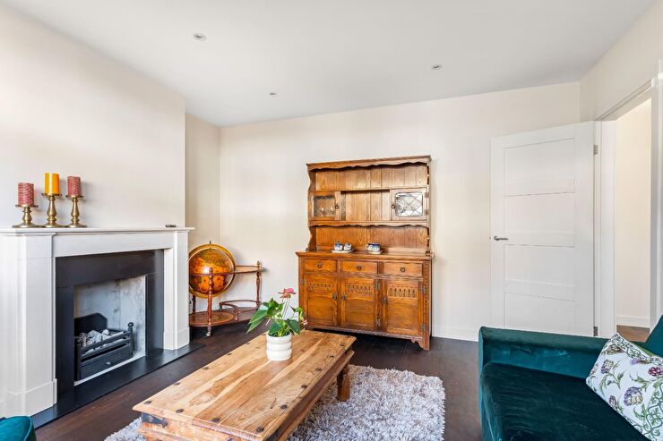 Bay window to front, radiator, recessed spotlights, feature fireplace, wall mounted heating thermostat, thermally treated solid oak flooring.