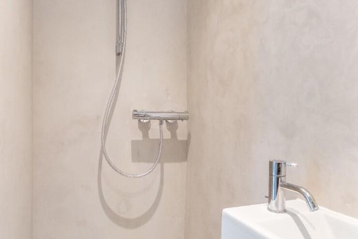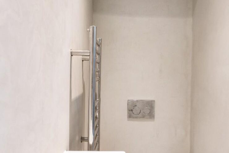 WC with concealed cistern & push button flush, wash hand basin with mixer tap, wall mounted shower unit, wall mounted extractor fan, ladder style heated towel rail, tiled floor.