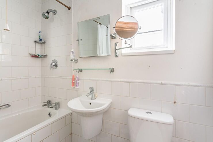 Panelled bath with wall mounted shower cubicle over, wash hand basin, low level WC, heated towel rail, part tiled walls, window to side.