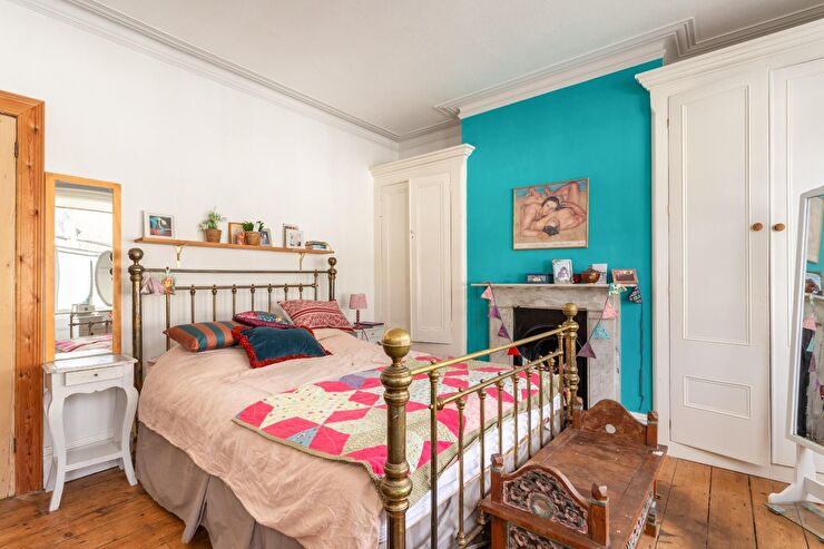 Sash bay window to front, further sash window, radiator, pair of built in wardrobes, attractive feature fireplace & mantle, wash hand basin, coved ceiling, access to the loft.