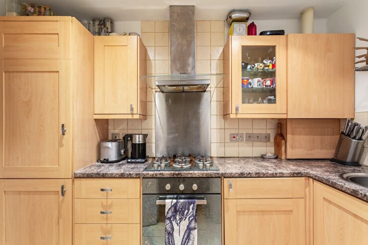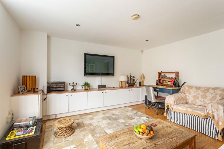 Bay window to front with views of St Peters Church, wood effect flooring, recessed spotlights, radiator, range of built in cupboards.