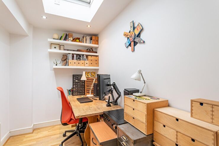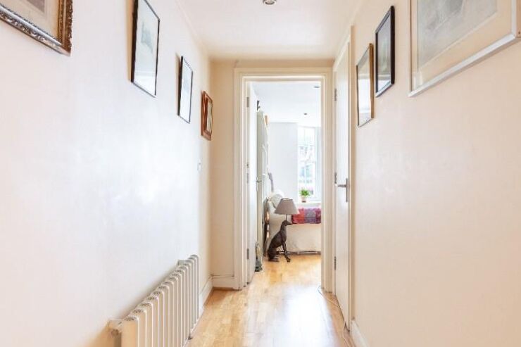Wood effect flooring, recessed spotlights, radiator, skylight.