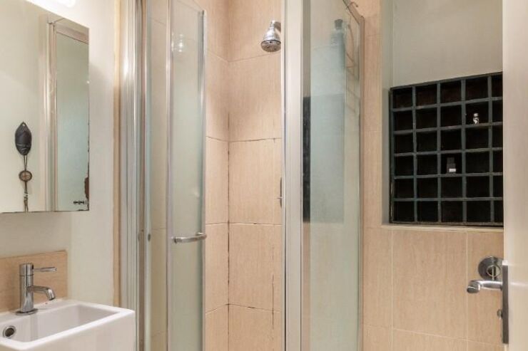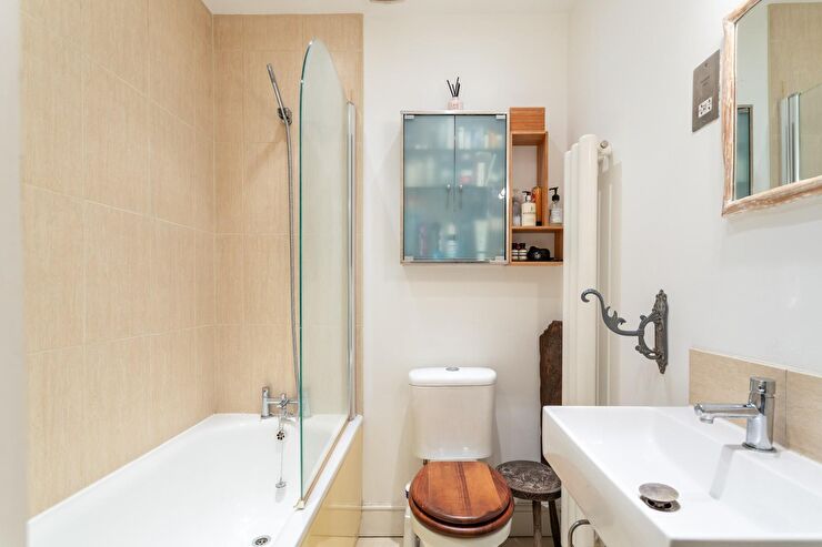 Panelled bath with mixer tap, wall mounted shower over, glass shower screen, WC, wash hand basin with mixer tap, upright radiator, recessed spotlights, part tiled walls, tiled floor.