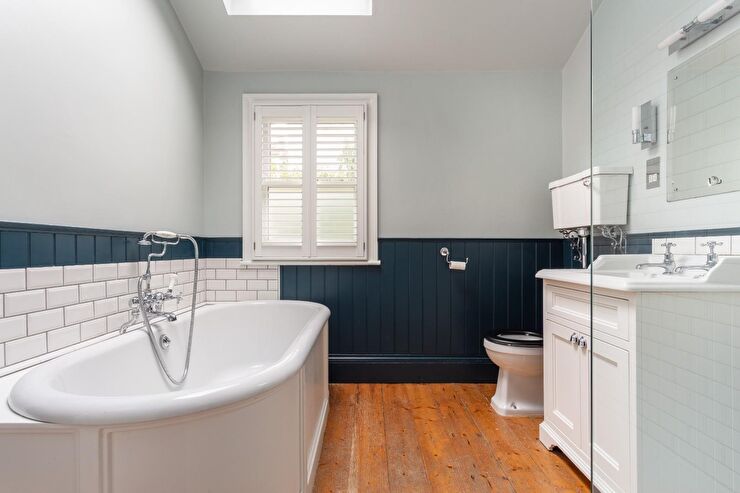 WC, wash hand basin with hot & cold taps, vanity storage below, freestanding panelled bath with mixer tap & hand held shower attachment, large walk in shower with mains fed 'rainfall' style shower over, part tiled walls, ladder style heated towel rail, wooden floorboards, Velux window, sash window to rear with frosted glass & fitted wooden shutters.