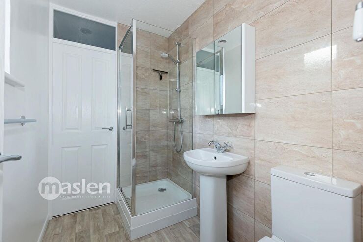 Double glazed side aspect window. Shower cubicle. Pedestal wash hand basin. Low Level WC. Wall mounted cabinet.