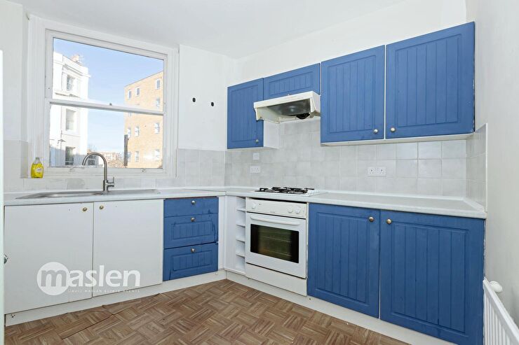 Front aspect window. Wall and base units incorporating the electric oven, four ring gas hob and extractor fan. Stainless steel sink and drainer with mixer tap. Space for fridge/freezer. Space for washing machine.