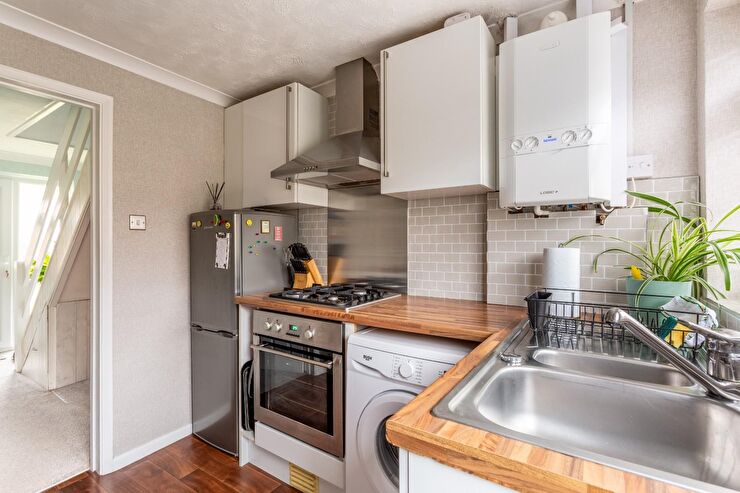 Range of wall, base & drawer units with roll edged work surfaces over, inset 1.5 bowl sink unit with mixer tap, space & plumbing for washing machine, integrated oven with 4 ring hob over extractor above, door to rear, window to rear, wall mounted 'Ideal' boiler, space for fridge freezer, part tilled walls, wood effect flooring.