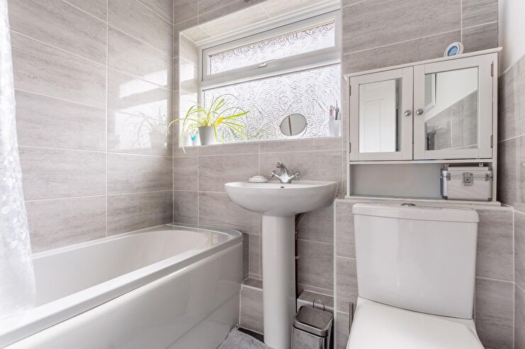 WC with push button flush, pedestal wash hand basin with mixer tap, panelled bath with mixer tap and shower unit over, part tilled walls, ladder style heated towel rail, laminate floor, window to rear with privacy glass.