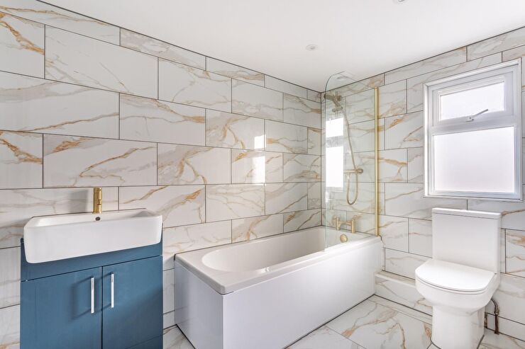 WC with push button flush, panelled bath with mixer tap, wall mounted shower over, glass shower screen, wash hand basin with mixer tap & vanity storage below, recessed spotlights, fully tiled walls, tiled floor, ladder style heated towel rail, window to rear with frosted glass.