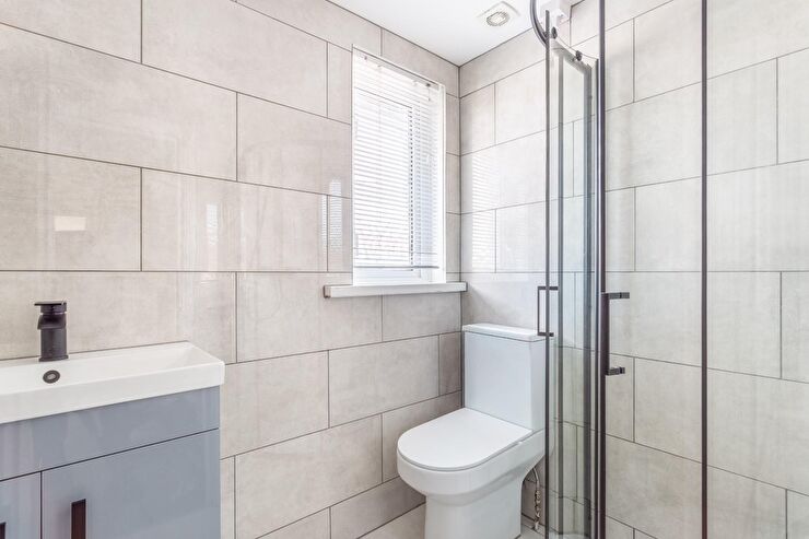 WC with push button flush, wash hand basin with mixer tap & vanity storage below, shower cubicle with wall mounted shower, ladder style heated towel rail, window to front with frosted glass, ceiling mounted extractor fan, tiled flooring, tiled walls.