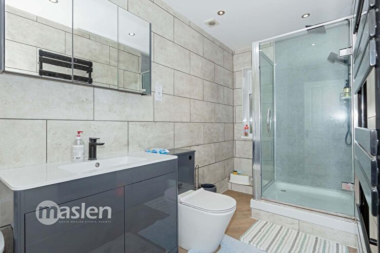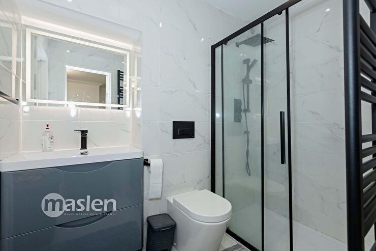 Double glazed side aspect window. Corner shower cubicle. Wash hand basin with storage under. Mirror fronted wall cabinet. Low level WC. Ladder style towel radiator.