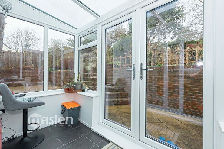Constructed of brick & uPVC double glazed windows & door with patterned glass, poly-carbonate roof, tiled floor, radiator, views to Downs & Sea, uPVC double glazed front door with patterned glass.