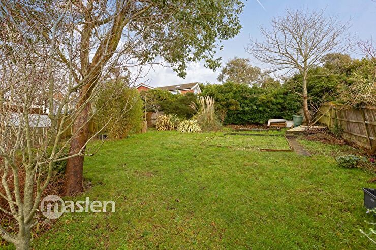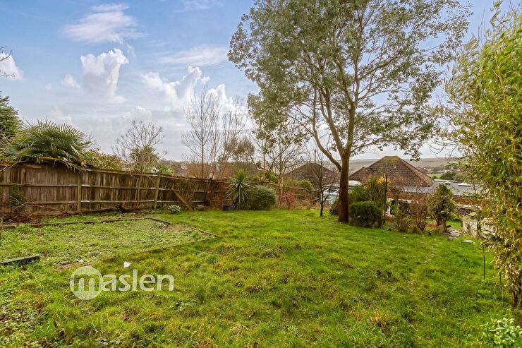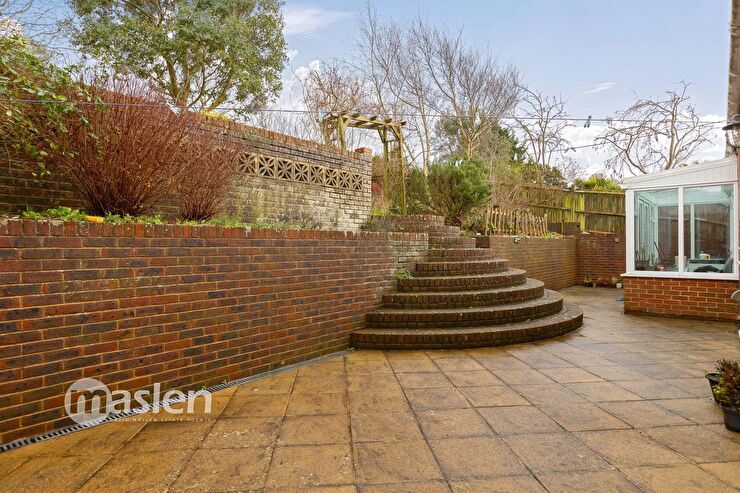 Gate to side, outside tap, path to rear garden, enclosed by brick walling & wooden fencing, sun terrace accessed from Utility Room, Living Room & Bedroom, outside lighting, raised flower border stocked with mature shrubs & tree, attractive brick steps & wooden arch trellis, leading up to lawned area with a central flower bed stocked with mature shrubs & trees, flower bed border stocked with mature plants, decked seating area, summer house, views to the Downs & the Sea, Garden shed, mature trees, green house, further garden shed & decked area, pebble pathway.