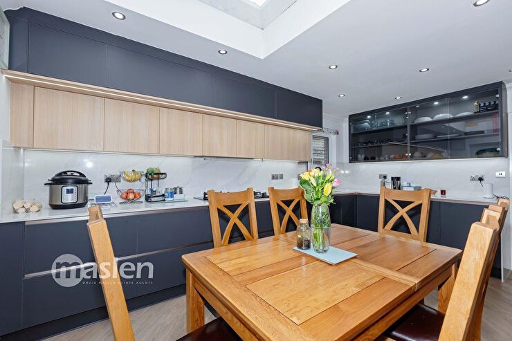 Range of Kitchen fitments comprising wall & base units, inset sink with mixer tap, integrated American Style fridge/freezer, integrated dishwasher, two built in ovens, five ring gas hob with extractor fan above, radiators, glass fronted display cabinets, skylight, built in storage cupboard, recessed spotlights, uPVC double glazed window to side, uPVC double glazed doors to Utility Room. Door to Living Room.