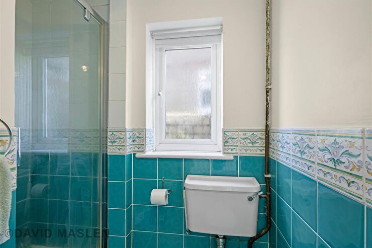 Comprising tiled shower cubicle with electric shower unit, wall mounted wash hand basin, low level W.C., part tiled walls, wood effect flooring, uPVC double glazed window to side.