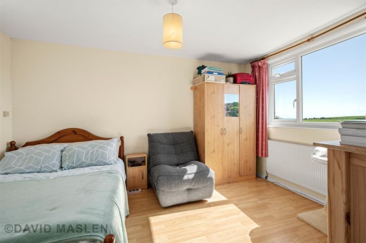 Central heating radiator, wood effect flooring, built in wardrobe with further cupboard above, uPVC double glazed window to rear overlooking rear garden & views over the south downs & towards the sea.