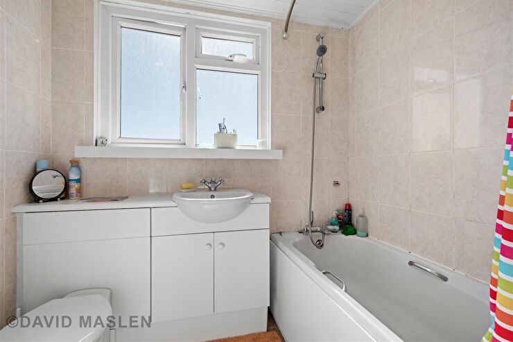Comprising panelled bath with mixer tap & shower attachment, vanity unit with inset wash hand basin with mixer tap, low level push button W.C. with concealed cistern, fully tiled walls & floor, uPVC double glazed window to rear.