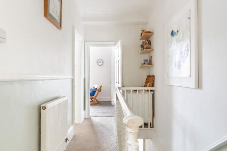 Stairs rising to first floor, coved ceiling, dado rail, picture rail, radiator, wall mounted heating thermostat, doors to all rooms.