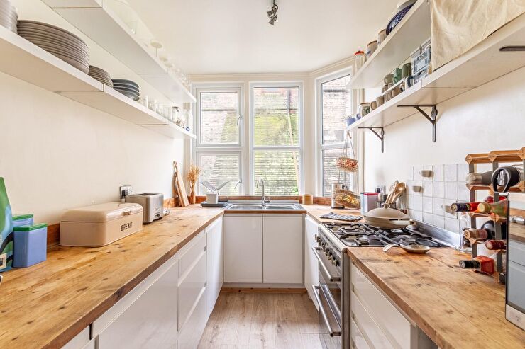 Range of base units with wooden work surface over, inset double bowl stainless steel sink unit with mixer tap, space for oven, space & plumbing for washing machine, integrated fridge & freezer, wall mounted shelving, double glazed window to rear, wood effect flooring.