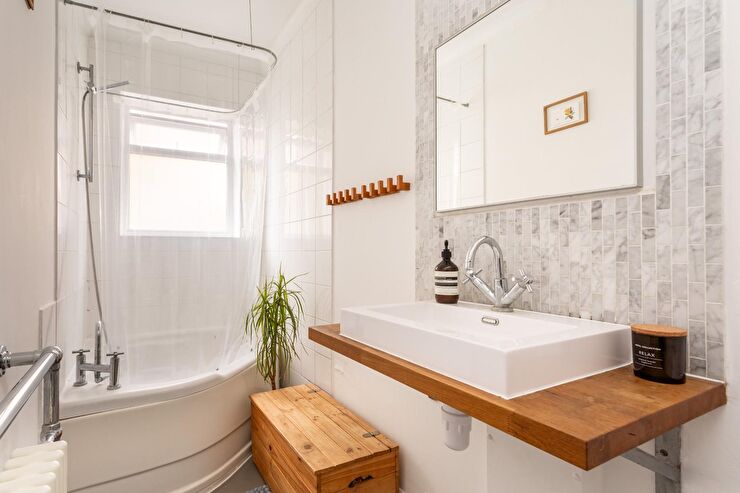 Suite comprising corner bath with mixer tap & shower attachment, wash hand basin with mixer tap, low level WC. Heated towel rail & radiator, double glazed window to rear, part tiled walls, laminate flooring.