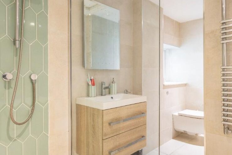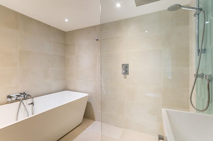 Built in storage cupboard, tiled floor, tiled walls, recessed spotlights, window to side, WC with concealed cistern & push button flush, wash hand basin with mixer tap & vanity storage below, walk in shower cubicle with rainfall style shower head, further hand held shower attachment, glass shower screen, bath with mixer tap & hand held attachment, ladder style heated towel rail, ceiling mounted extractor fan, hatch to loft space.