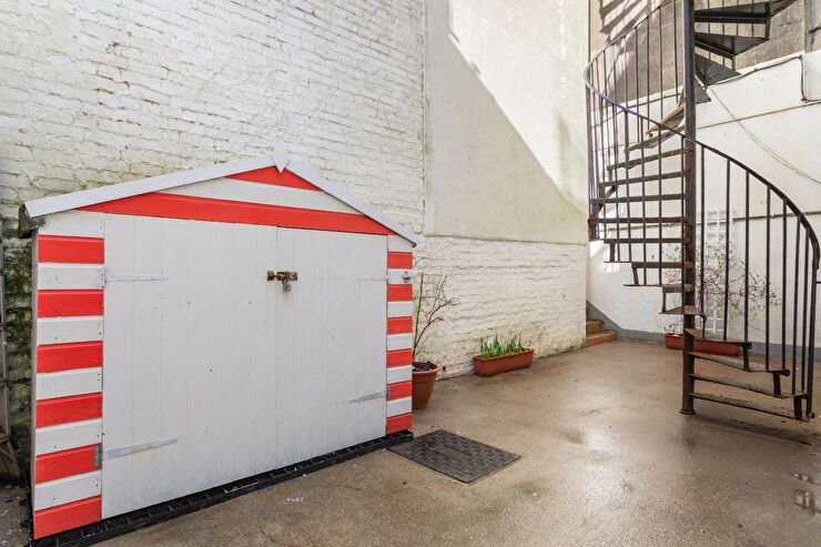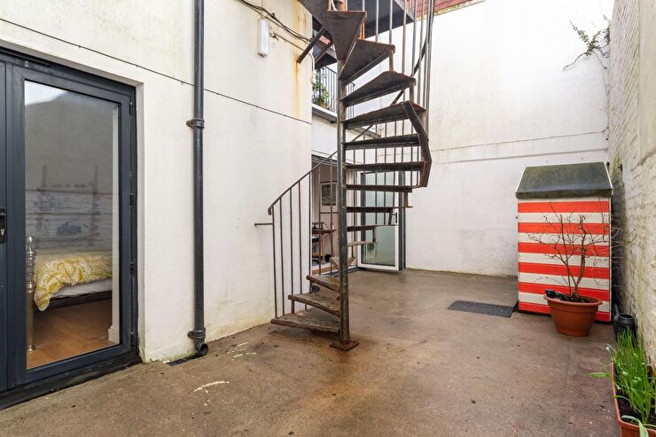 Patio garden enclosed by brick walling, timber built storage shed, fire escape staircase.