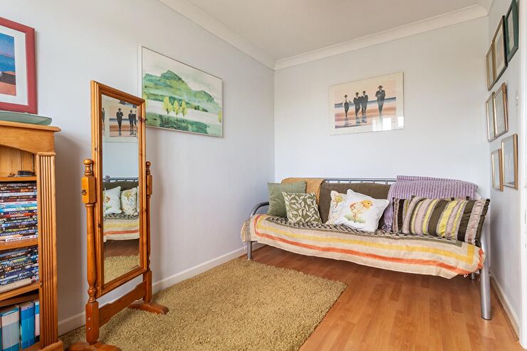 Double glazed window to rear with pretty sea views, radiator, laminate flooring.