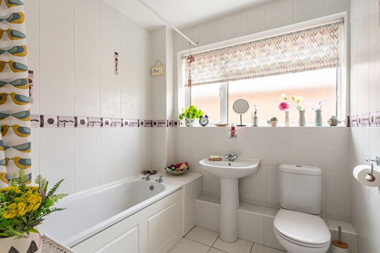 White suite comprising panelled bath with 'Mira' electric shower over, pedestal wash hand basin with mixer tap, low level WC with dual flush, radiator, tilled walls, tilled flooring, double glazed window to side with privacy glass.