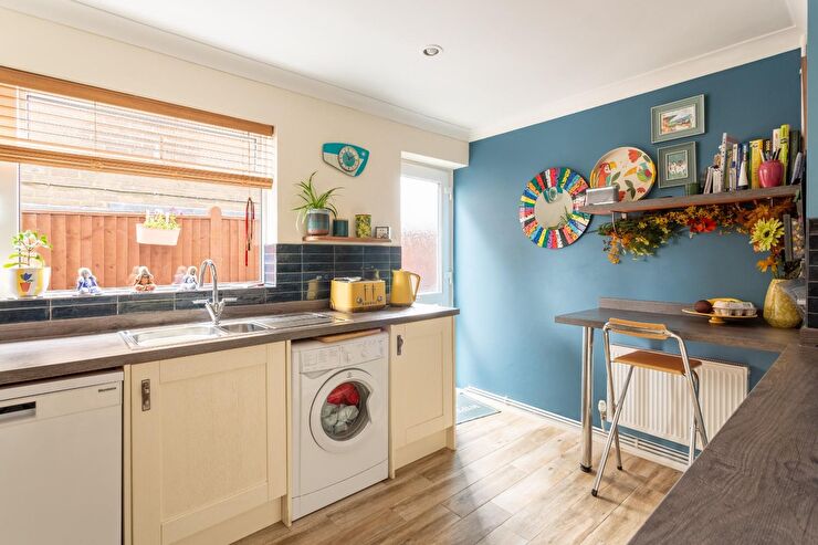 Range of wall and base units with roll edged work surfaces over, inset 1.5 bowl stainless steel sink unit with mixer taps and drainer, space for range cooker, integrated fridge/freezer, space and plumbing for washing machine and dishwasher, radiator, ceiling spotlights, part tilled walls, tiled flooring, double glazed window to side and double glazed patio door to side of the house.
