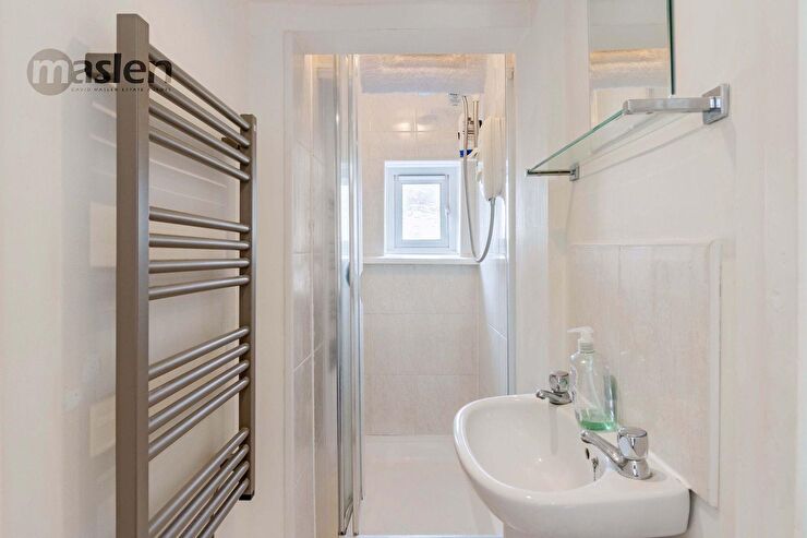 Shower cubicle with pedestal wash hand basin. Radiator. Double glazed rear aspect window.