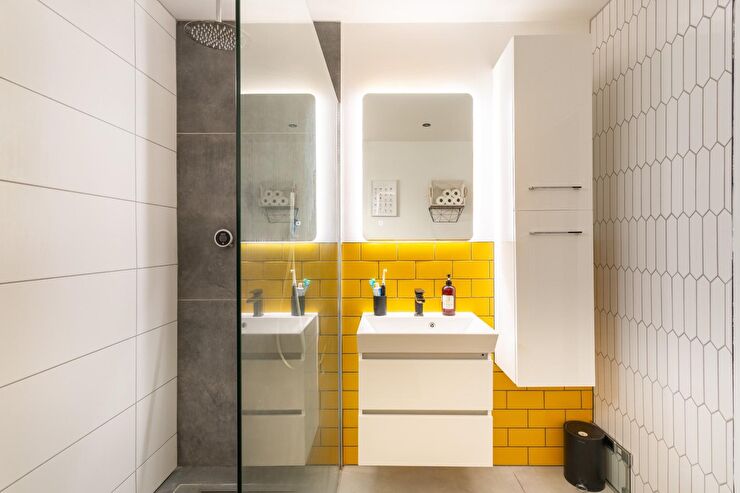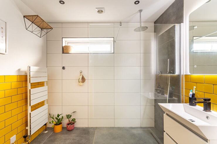 WC with concealed cistern & push button flush, wash hand basin with mixer tap & vanity storage below, large walk in shower with rainfall style shower head & further hand held attachment, glass shower screen, ladder style heated towel rail, high level window, ceiling mounted extractor fan, recessed spotlights, part tiled walls, tiled floor.