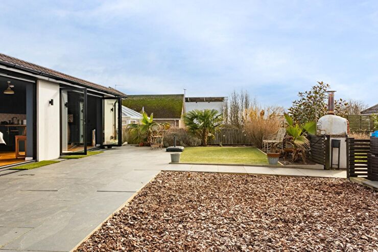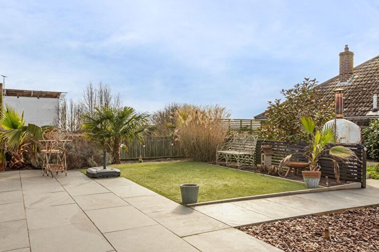 Patio seating area, section laid to artificial grass, section laid to wooden shingle, electric points, brick built pizza oven, borders filled with mature shrubs & plants, outside lighting, amazing views of the downs, timber storage shed, gate to side, gate to front leading to side garden.