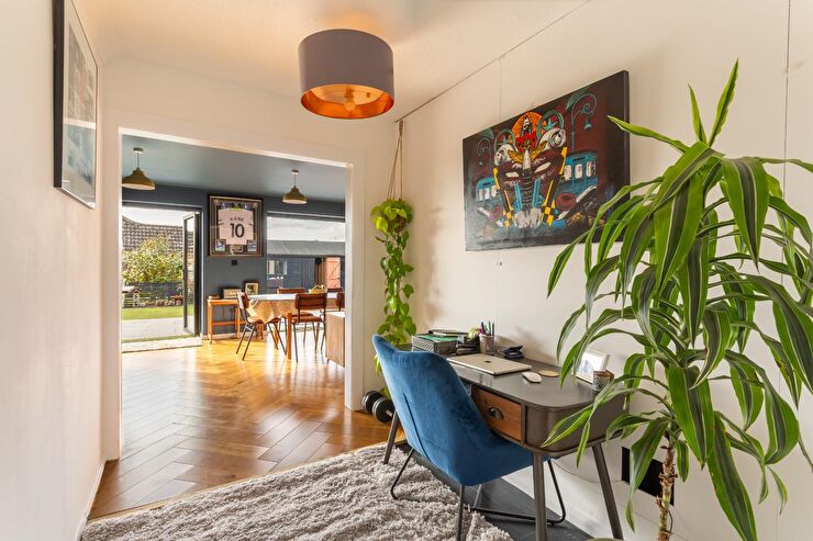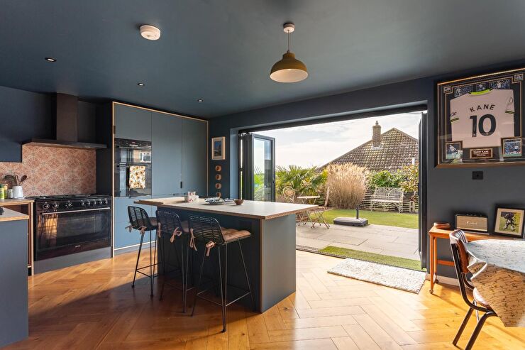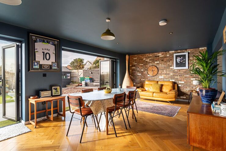 Herringbone flooring, feature brick wall, recessed spotlights, bifold doors to rear, archway into: