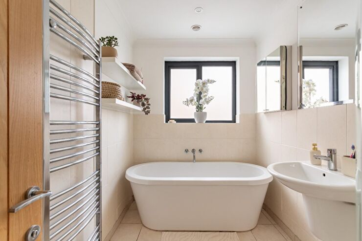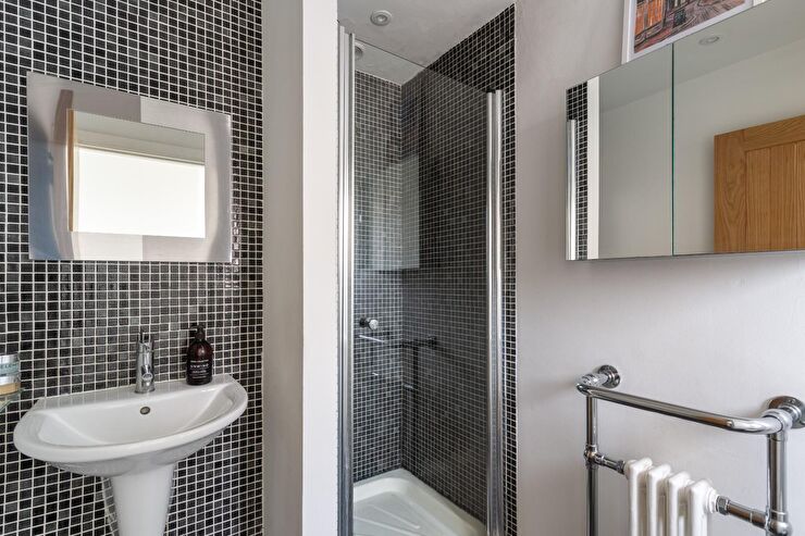 Freestanding bath with mixer tap, wash hand basin with mixer tap, corner shower cubicle with mains fed shower over, hatch to loft space, window to side with frosted glass, recessed spotlights, part tiled walls, tiled floor, ladder style heated towel rail.