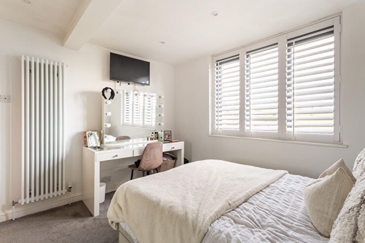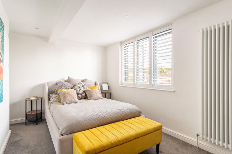 Window to rear with fitted wooden shutters, views of the downs, recessed spotlights, upright radiator.