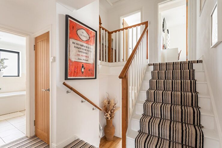 Doors to all rooms, built in storage cupboard, radiator, wall mounted thermostat, stairs rising to first floor & stairs descending to lower ground floor.